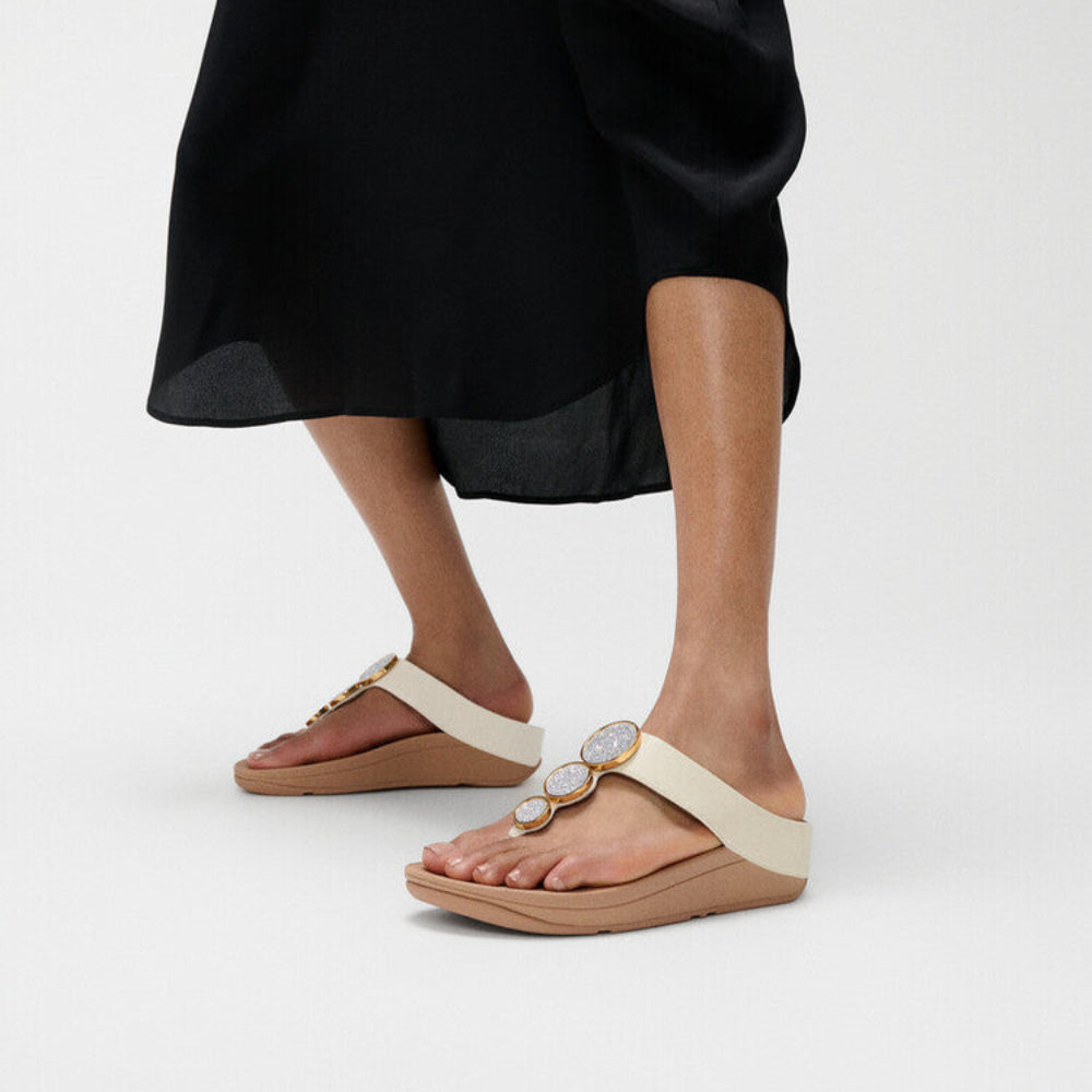 รองเท้าแตะแบบหูหนีบที่ดูหรูหรารุ่นนี้เป้นคอลเลคชั่นที่ดีไซน์ตกแต่งด้วย 'คริสตัล' เม็ดเล็กเป็นประกาย ซึ่งอยู่ในกรอบโลหะมันเงา เป็นรูปทรงกลม 3 ชิ้นที่ประดับอยู่ส่วนหน้าของสายคาดที่ตัดเย็บจากหนังเทียมเคลือบมุกเมทัลลิกเพิ่มความแวววาวเป็นพิเศษ พื้นรองเท้าทำจากเทคโนโลยี Microwobbleboard™ ที่ลดแรงกดทับ รองรับแรงกระแทก เอกสิทธิ์เฉพาะของ FitFlop เพื่อความสบายตามหลักสรีรศาสตร์