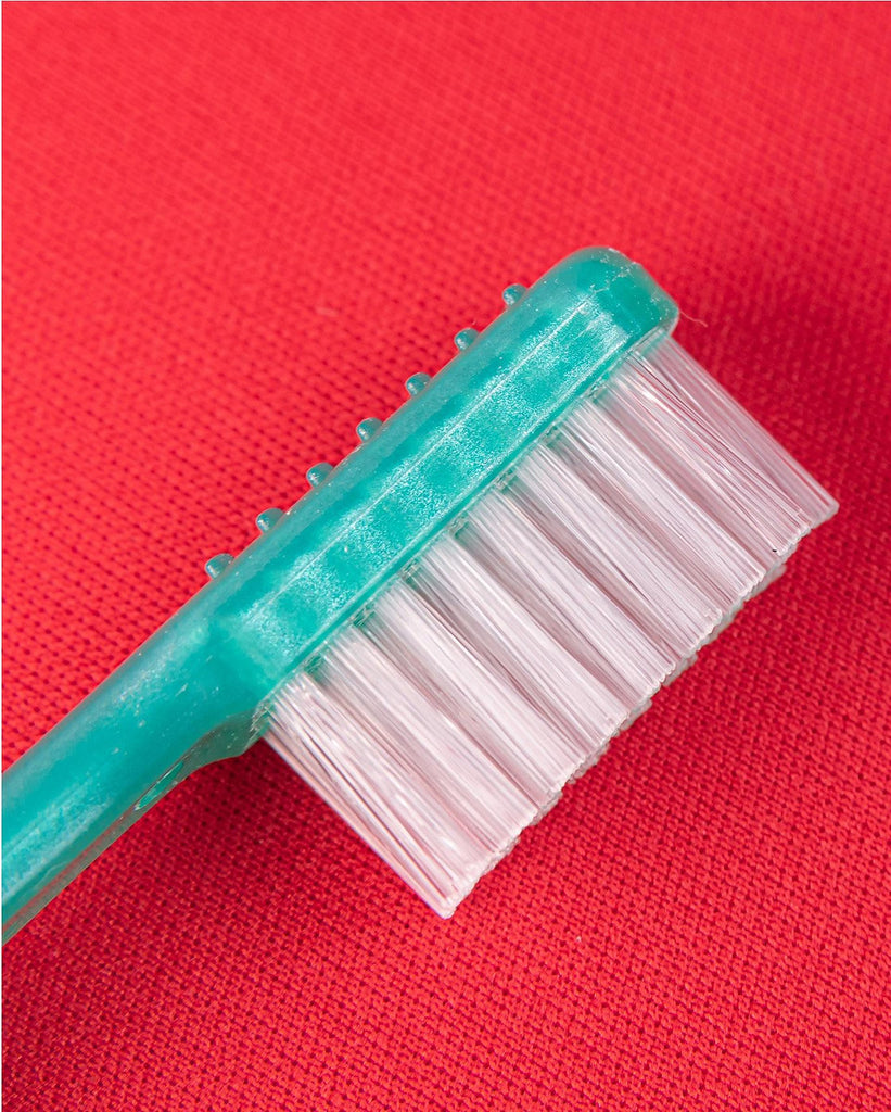 - Gently scrub with a toothbrush dipped in warm water and mild detergent.