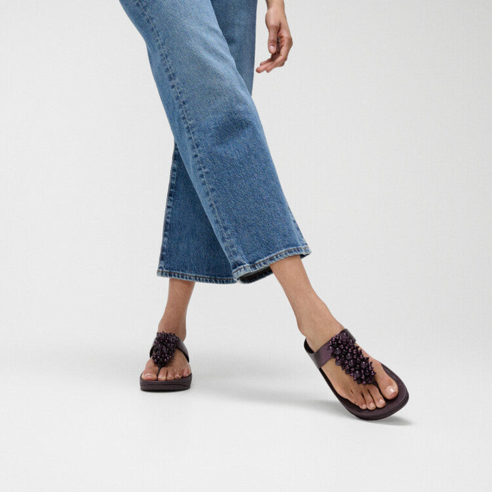 On FitFlop's Microwobbleboard™ midsoles for unbeatable all-day cushioning. This season crafted in soft, metallic, pearlized faux-leather. Featuring a central strap swathed in glossy glittering 'bauble-beads' (in a mix of opaque, clear and mirror-finished). Slip on for daytime glitz, parties, evenings out, or any time you want to feel fabulous.