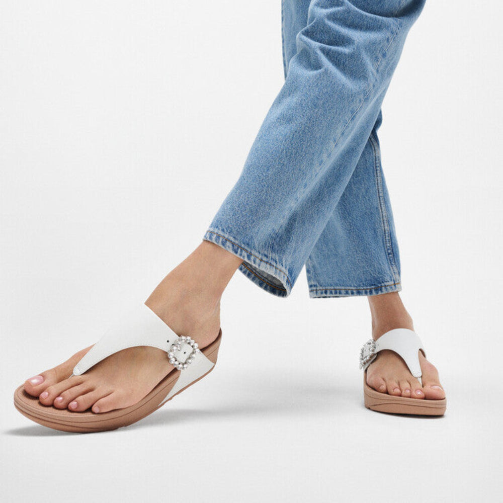On FitFlop's Microwobbleboard™ midsoles to deliver unbeatable cushioning and comfort throughout your day. Crafted in smooth leather. This adjustable version, adorned with an elegant buckle, featuring shimmering 'crystals' set in a shiny silver base. Subtly glamorous sandals, with just the right amount of sparkle – for parties, evenings out or dressing up a daytime look.