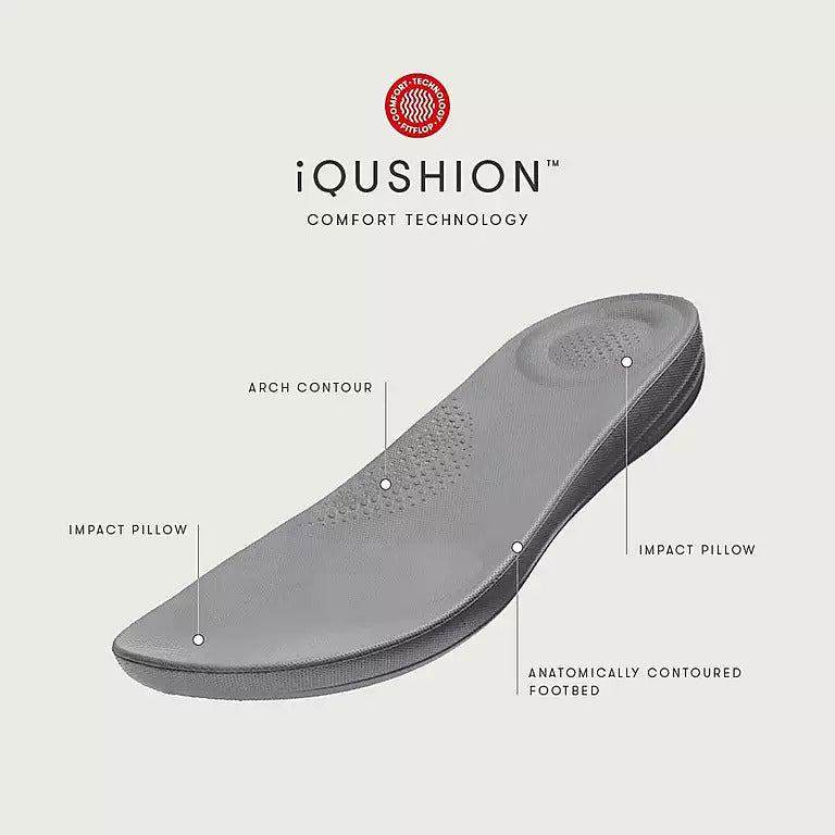 เทคโนโลยี IQUSHION™ ของ Fitflop เป็นการออกแบบที่ช่วยกระจายแรงกดที่ใต้ฝ่าเท้า ด้วยวัสดุพิเศษของแบรนด์ Fitflop ที่เบาและทนทาน พร้อมด้วย Impact pillows ที่ช่วยดูดซับแรงกระแทกจากทุกการก้าวเดิน ลดการทำงานของกล้ามเนื้อ ทำให้สามารถเดินได้ยาวนานขึ้น ด้วยการออกแบบให้เป็นรุปทรงของเท้า ทำให้สามารถลดการใช้แรง “จับ” ด้วยนิ้วเท้า