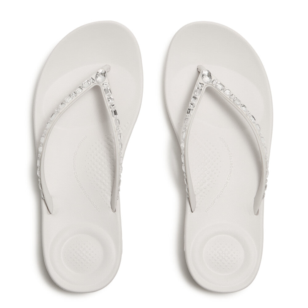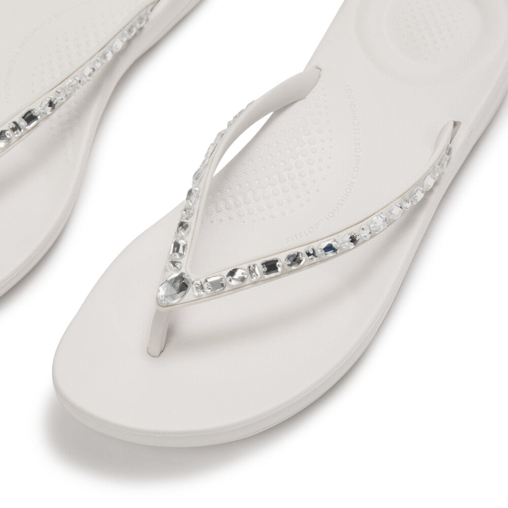รองเท้าแตะชายหาดแบบคลาสสิก พื้นรองเท้าชั้นกลาง iQushion™ น้ำหนักเบาของ FitFlop ซึ่งพัฒนาโดยไบโอเมคานิกส์เพื่อเพิ่มความสบายและการรองรับสูงสุดในดีไซน์เพรียวบาง สายรัดที่ออกแบบตามหลักกายวิภาคศาสตร์ที่ยึดรองเท้าแตะไว้กับตัวคุณ ประดับด้วย 'คริสตัล' รูปทรงหนาแวววาวหลายรูปทรง (เจียระไนเพื่อให้รับแสงเมื่อคุณเคลื่อนไหว)